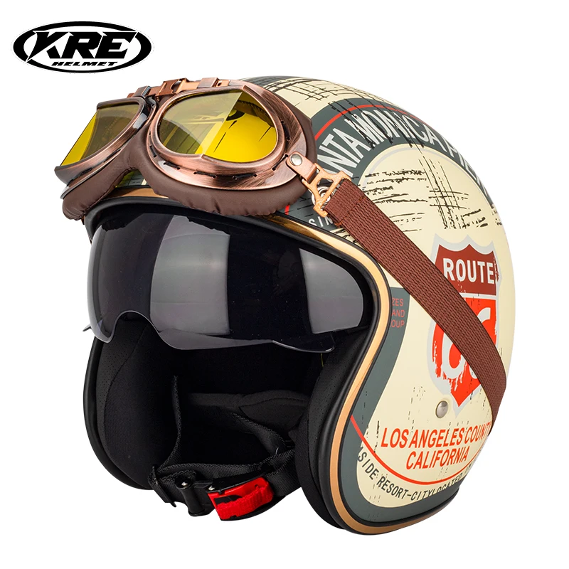 ვინტაჟური სტილის, ღია ჩაფხუტი მოსახსნელი პატარა კეპით და სათვალეებით
